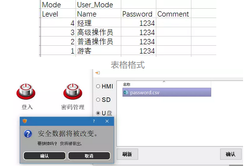 (2)結(jié)合其他專案內(nèi)容,下載到人機(jī)界面中,使用改功能時一樣也需要先登入哦。然后選擇U盤路徑下載的用戶文件(.CSV格式的文件,可以用EXCEL軟件打開編輯),具體表格格式如下: