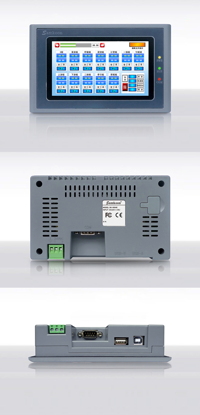 Samkoon SK系列觸摸屏是一款基于Linux系統的人機界面,符合EN55022和EN55024標準,符合FCC、CE、Class A,具有很強的抗干擾能力,符合工業環境的電磁兼容要求。該款產品配備有高性能的Cortex A8處理器,及高容量FLASH,可存儲大量數據,實現數據斷電不丟失;支持U盤存儲,可以實現數據的導入導出、工程更新及配方更新功能;支持在線及離線模擬,可直接從PLC中獲取數據;支持串口打印機,顯現畫面及數據打印;支持一屏多機,實現最大連接32個PLC或智能設備;支持多國語言,可實現5種語言任意切換;支持以太網通訊下載功能。