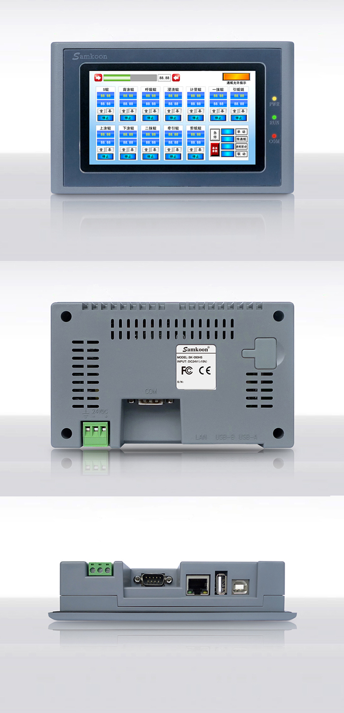 Samkoon SK系列觸摸屏是一款基于Linux系統(tǒng)的人機界面,符合EN55022和EN55024標(biāo)準(zhǔn),符合FCC、CE、Class A,具有很強的抗干擾能力,符合工業(yè)環(huán)境的電磁兼容要求。該款產(chǎn)品配備有高性能的Cortex A8處理器,及高容量FLASH,可存儲大量數(shù)據(jù),實現(xiàn)數(shù)據(jù)斷電不丟失;支持U盤存儲,可以實現(xiàn)數(shù)據(jù)的導(dǎo)入導(dǎo)出、工程更新及配方更新功能;支持在線及離線模擬,可直接從PLC中獲取數(shù)據(jù);支持串口打印機,顯現(xiàn)畫面及數(shù)據(jù)打印;支持一屏多機,實現(xiàn)最大連接32個PLC或智能設(shè)備;支持多國語言,可實現(xiàn)5種語言任意切換;支持以太網(wǎng)通訊下載功能。