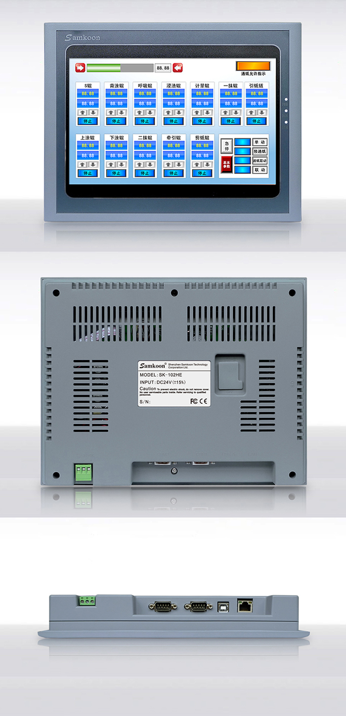 Samkoon SK系列觸摸屏是一款基于Linux系統(tǒng)的人機界面,符合EN55022和EN55024標(biāo)準(zhǔn),符合FCC、CE、Class A,具有很強的抗干擾能力,符合工業(yè)環(huán)境的電磁兼容要求。該款產(chǎn)品配備有高性能的Cortex A8處理器,及高容量FLASH,可存儲大量數(shù)據(jù),實現(xiàn)數(shù)據(jù)斷電不丟失;支持U盤存儲,可以實現(xiàn)數(shù)據(jù)的導(dǎo)入導(dǎo)出、工程更新及配方更新功能;支持在線及離線模擬,可直接從PLC中獲取數(shù)據(jù);支持串口打印機,顯現(xiàn)畫面及數(shù)據(jù)打印;支持一屏多機,實現(xiàn)最大連接32個PLC或智能設(shè)備;支持多國語言,可實現(xiàn)5種語言任意切換;支持以太網(wǎng)通訊下載功能。